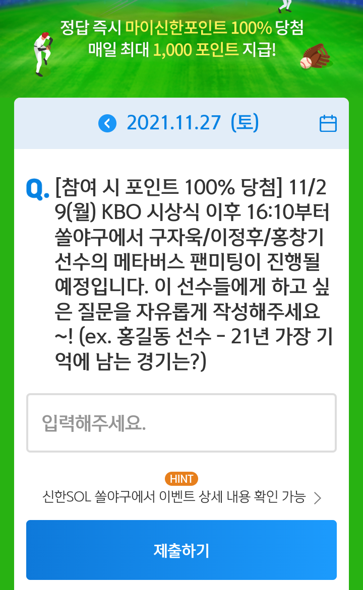 매일 야구상식 쏠퀴즈 풀고 마이신한포인트 최대 1000포인트 받아가세요.