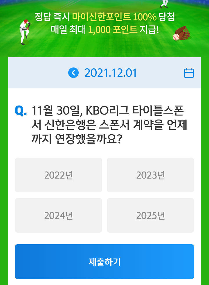 매일 야구상식 쏠퀴즈 풀고 마이신한포인트 최대 1000포인트 받아가세요.