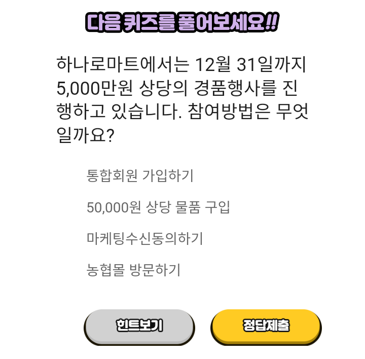 - 하나로유통 퀴즈 : 2021.12.11 ~ 2021.12.20