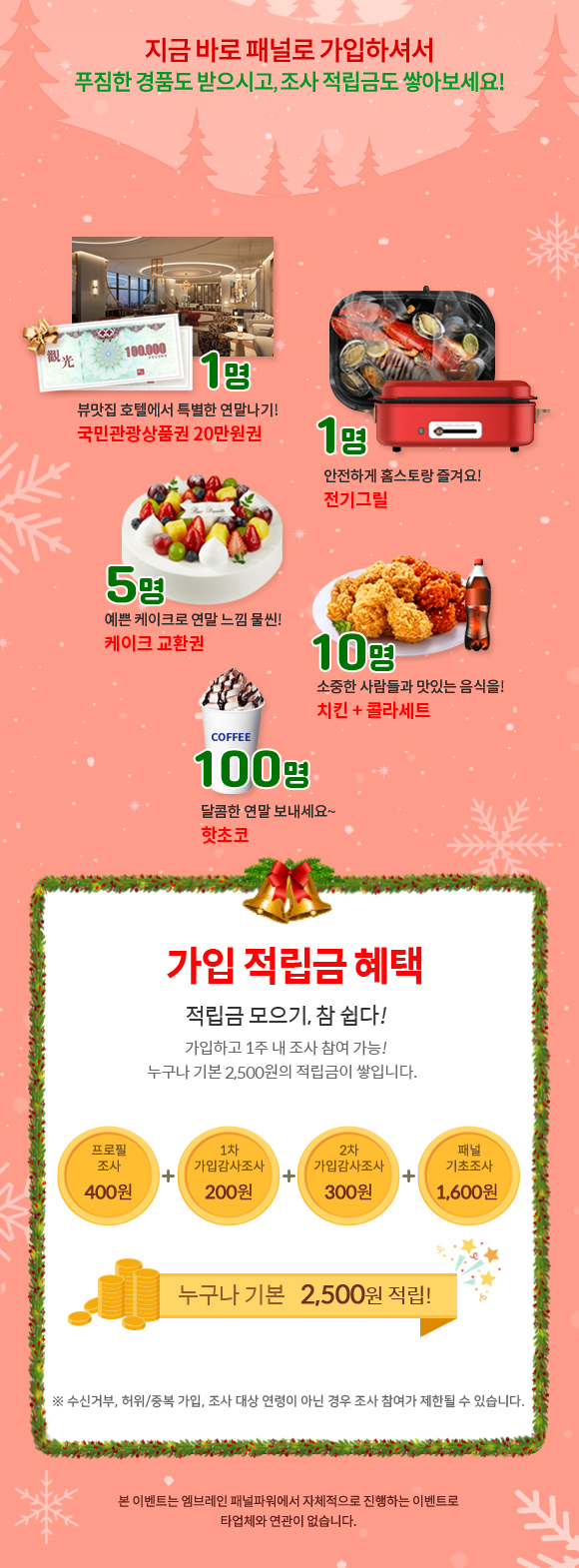 - 엠브레인 패널파워에 가입한 신규가입자 중 추첨을 통해 가입축하선물을 준다.