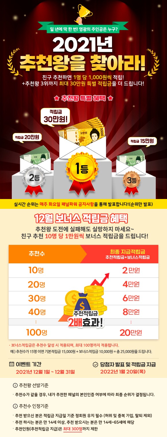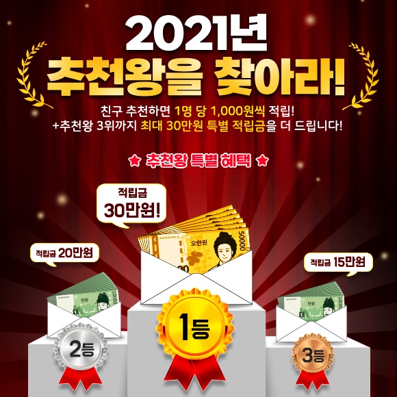 - 추천왕 특별혜택 : 1등(적립금 30만원), 2등(적립금 20만원), 3등(적립금 15만원)