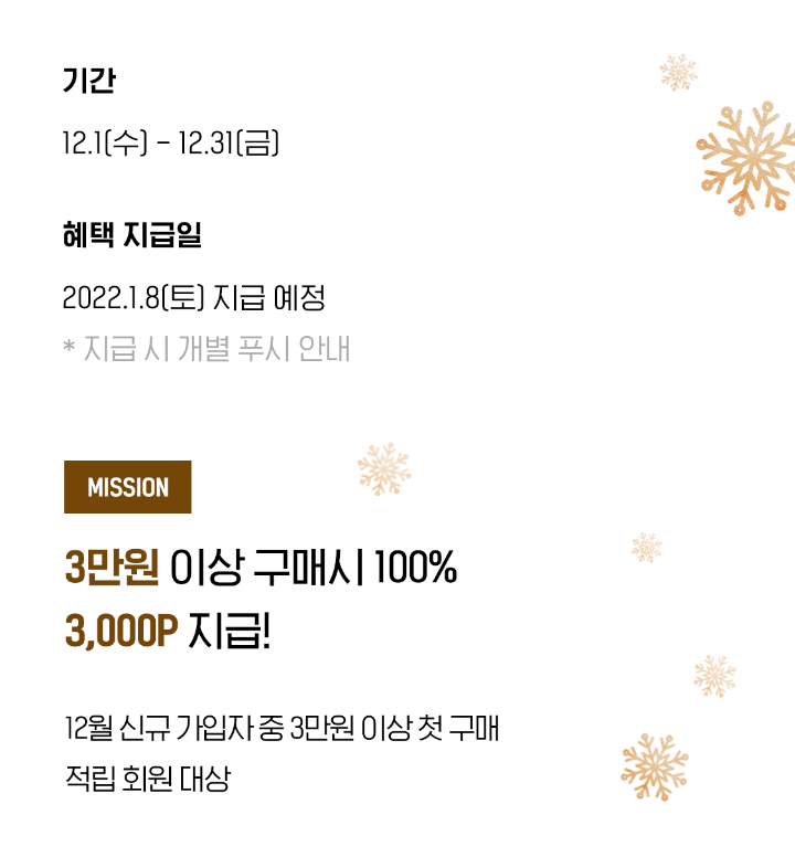 - 미션 : 3만원 이상 구매시 100% 3000P 지급