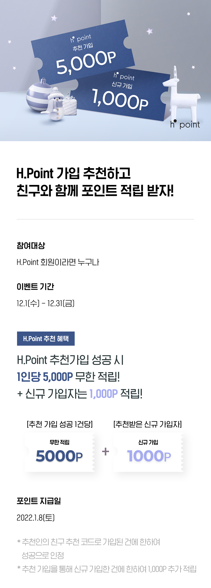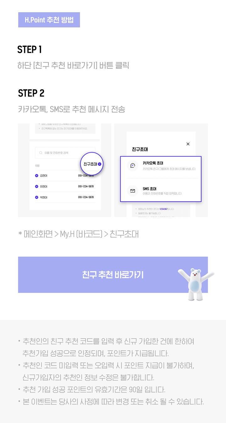 - H.Point 추천가입 성공 시 1인당 5000P 무한 적립! + 신규가입자는 1000P 적립!