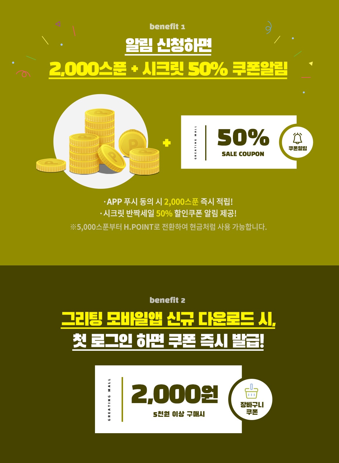 - 그리팅 모바일앱 신규 다운로드 시, 첫 러그인 하면 2000원 장바구니 쿠폰 즉시 발급