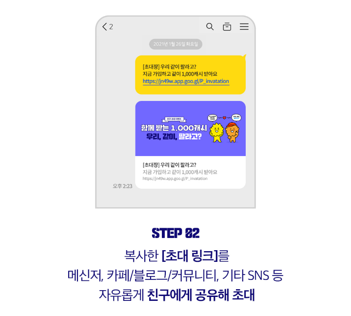 step 2) 복사한 [초대 링크]를 메신저, 카페/블로그/커뮤니티, 기타 SNS 등 자유롭게 친구에게 공유해 초대