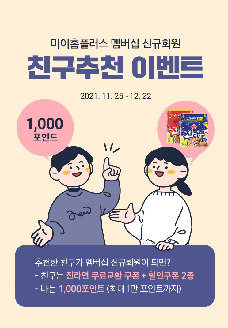 마이홈플러스(My homeplus) 멤버십 친구추천 이벤트가 11.25~12.22 까지 진행중이다. 마이홈플러스 가입할때 추천번호( adbee7d16711 )를 입력하고 가입하면 진라면 교환쿠폰과 할인쿠폰 2종이 지급된다.