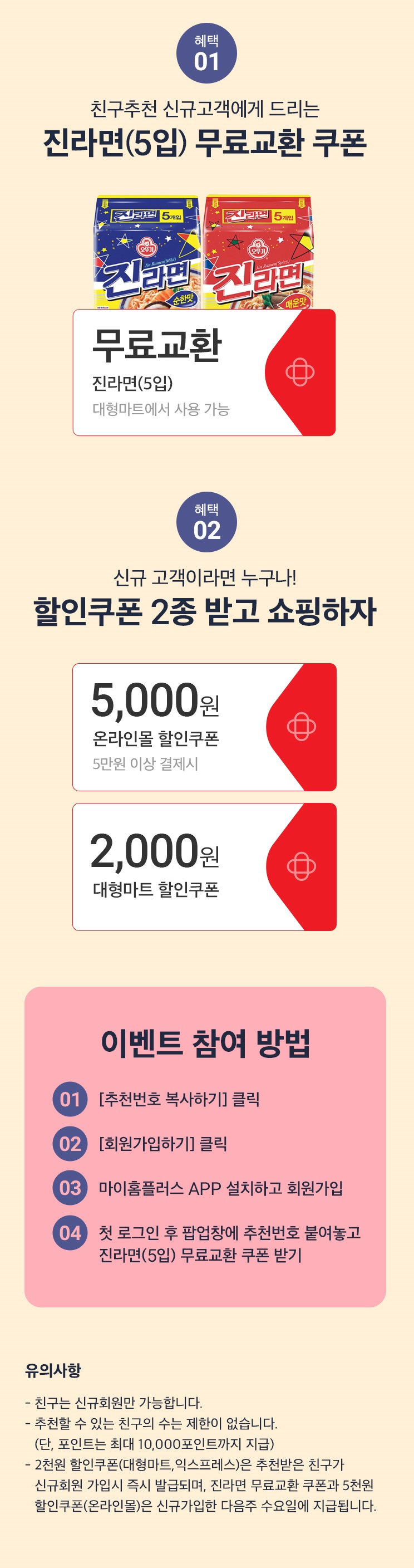 - 혜택1 : 진라면(5입) 무료교환 쿠폰(매운맛/순한맛)
