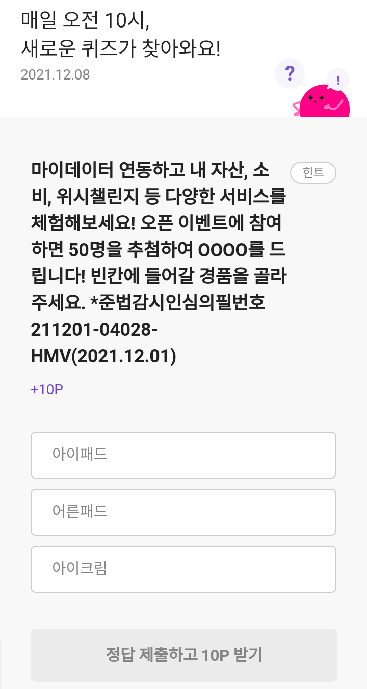 리브메이트 오늘의 퀴즈(21.12.08), 퀴즈정답, 마이데이터 연동하고 내 자산