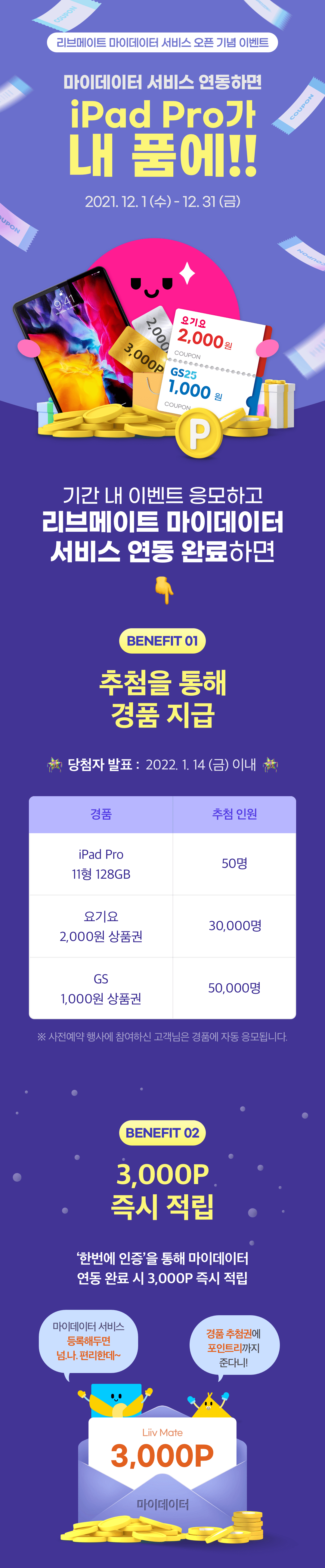 (IPad Pro 11형 128GB(50명), 요기요 2000원 상품권, GS 1000원 상품권)