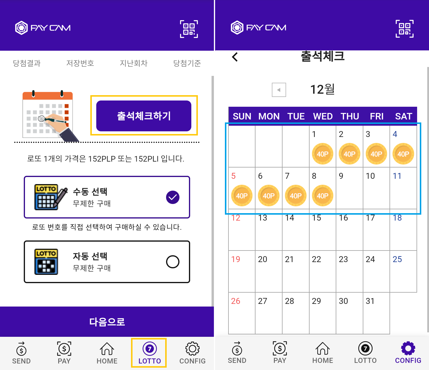 3) 화면 하단 우측 LOTTO 클릭 > 출석체크 40 PLP 적립