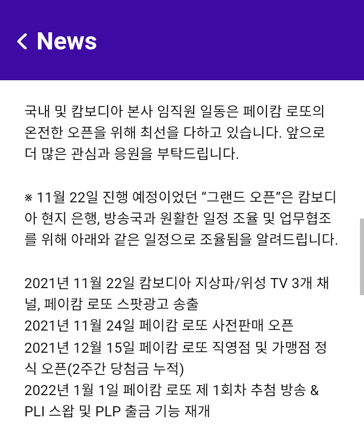 - 2021년 12월 15일 페이캄 로또 직영점 및 가맹점 정식 오픈(2주간 당첨금 누적)