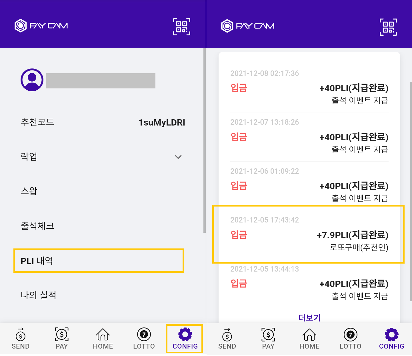 페이캄월렛에 가입하면 보너스로 300PLI가 지급되고, 매일 출석체크를 하면 40PLI가 적립된다. 추천코드를 입력하고 가입한 친구가 페이캄로또를 구매하게 되면 구매대금의 5%가 추천인에게 실시간 환급된다.