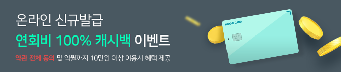 - 우리카드 홈페이지(PC/모바일/앱)에서 대상카드 발급 후 조건 모두 충족시, 연회비 100% 캐시백