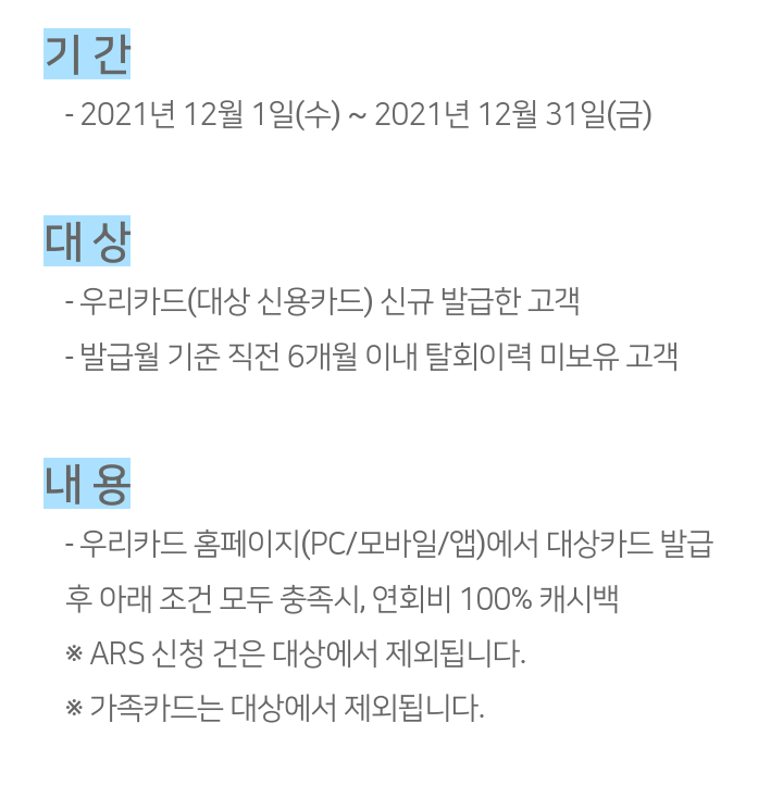 - 우리카드의 다른 발급프로모션 혜택과 중복 적용되지 않는다.