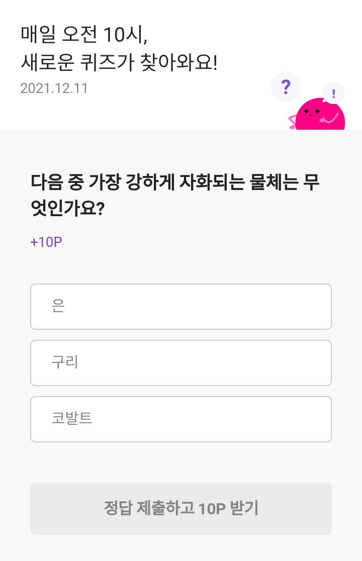 리브메이트 오늘의 퀴즈(21.12.11), 퀴즈정답, 다음 중 가장 강하게 자화되는 물체