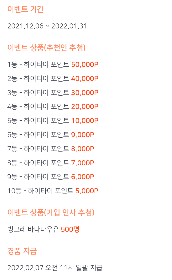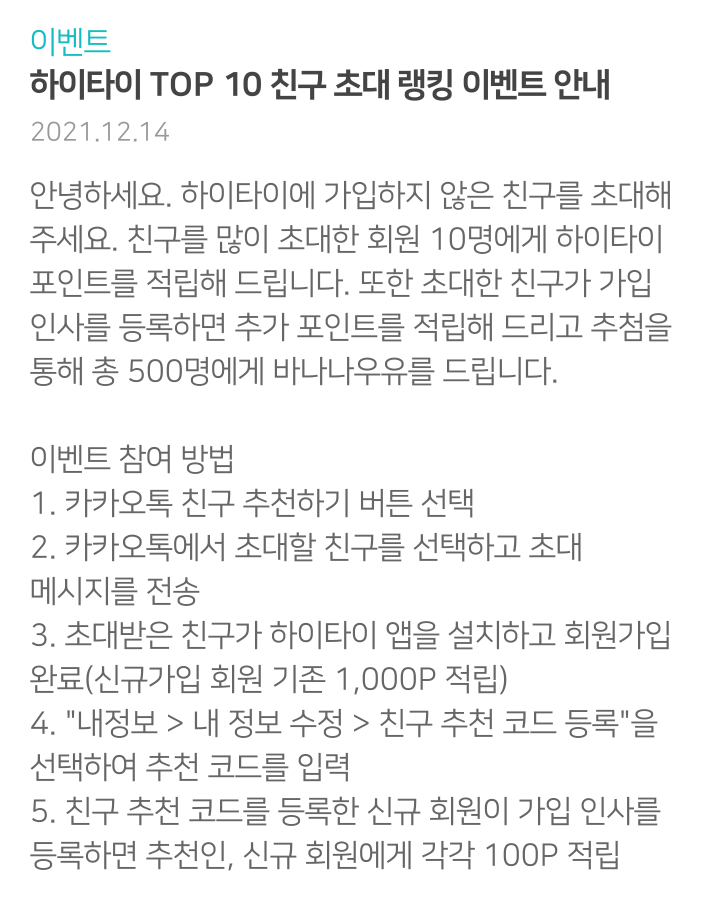 현재 하이타이(Hitai)에서 친구초대 랭킹 이벤트를 진행중인데, 신규 가입 회원에게 1000P가 적립된다. 친구를 많이 초대한 회원 10명에게 하이타이 포인트가 지급되고, 초대한 친구가 가입 인사를 등록하면 추가 포인트와 추첨 상품이 지급된다.