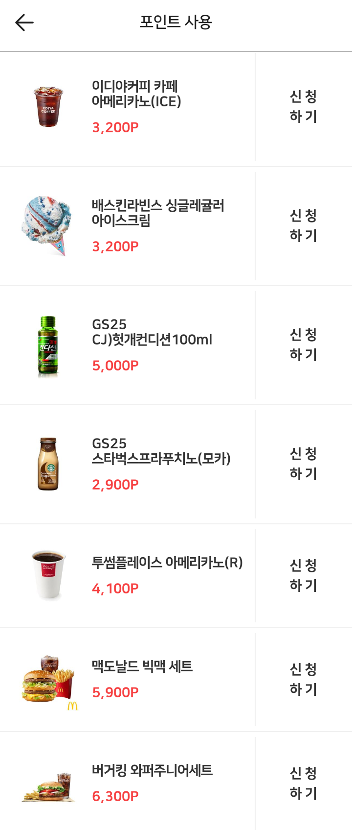 적립한 포인트 유효기간은 6개월이며, 최초 5000P 이상이 되면 사용할 수 있고 이후에는 5000P 이하여도 사용할 수 있다. 적립한 포인트로는 기프티콘을 구입할 수 있다.