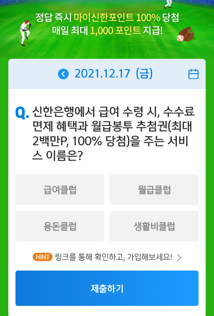 신한쏠, 야구상식 쏠퀴즈(21.12.17), 퀴즈정답, 신한은행에서 급여 수령 시