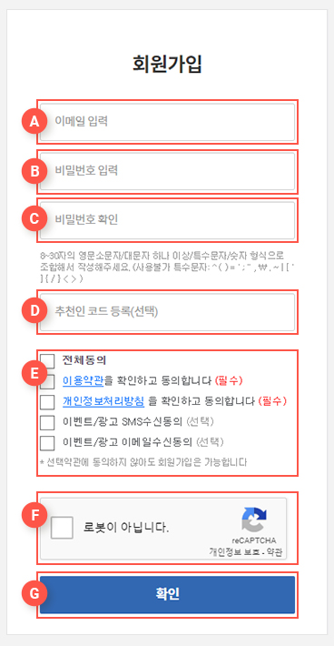 E) 이용약관/개인정보 취급방침을 반드시 확인하고 체크한다.