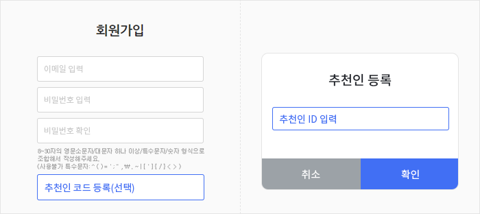 - 회원가입 시, 회원님의 추천ID 를 입력 후, 회원가입을 완료한다.