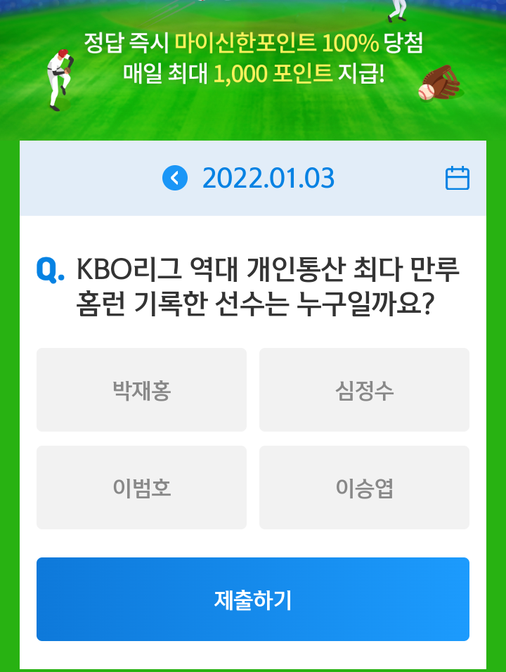 매일 야구상식 쏠퀴즈 풀고 마이신한포인트 최대 1000포인트 받아가세요.