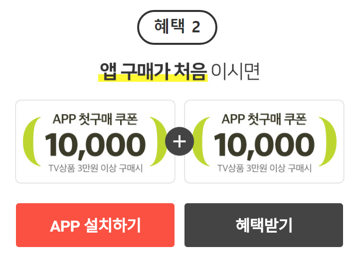 - 혜택2 : APP 첫구매 쿠폰 1만원(x2장)