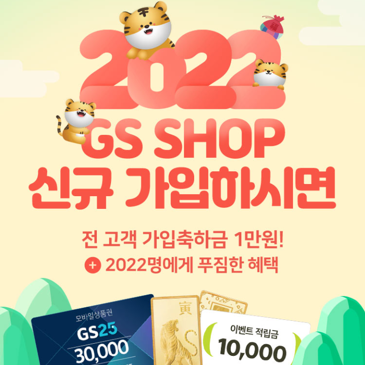 이벤트 혜택으로는 GS SHOP 신규가입 적립금(10000원), 신규 고객 대상 경품(GS25 모바일상품권 3만원 2021명, 순금 호랑이 골드바 37.5G(1명)), 앱 첫구매 쿠폰(10000원x2장), 친구추천 적립금(6000원)이 적립금과 쿠폰이 지급된다.