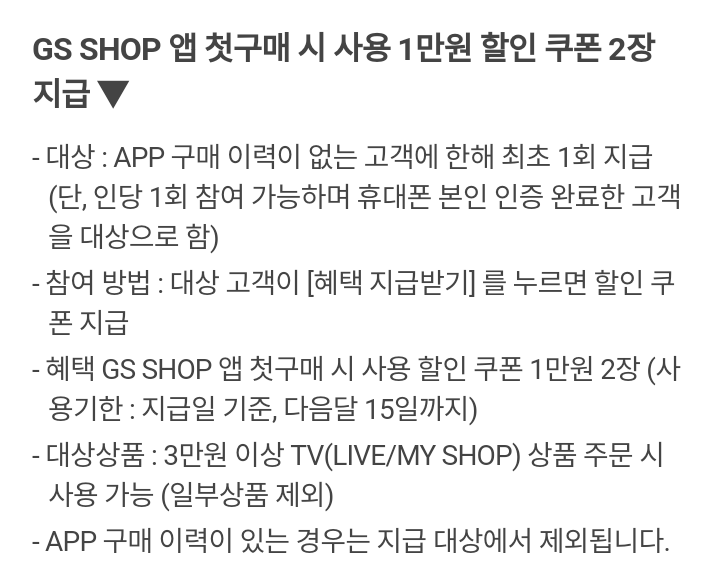 - 혜택 GS SHOP 앱 첫구매 시 사용 할인 쿠폰 1만원 2장 (사용기한 : 지급일 기준, 다음달 15일까지)