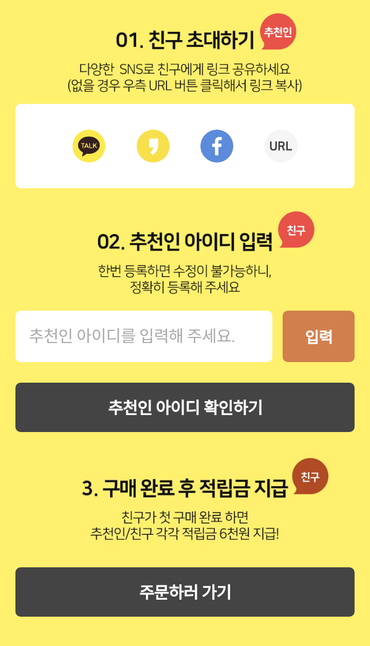 - 친구가 첫 주문 완료하면 친구도 나도 적립금 6천원 지급!