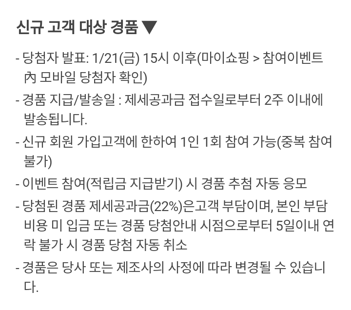- 당첨자 발표: 1/21(금) 15시 이후(마이쇼핑 > 참여이벤트 內 모바일 당첨자 확인)
