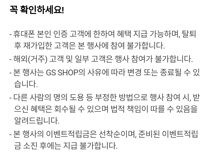 꼭 확인하세요! - 해외(거주) 고객 및 일부 고객은 행사 참여가 불가합니다. - 본 행사는 GS SHOP의 사유에 따라 변경 또는 종료될 수 있습니다. - 다른 사람의 명의 도용 등 부정한 방법으로 행사 참