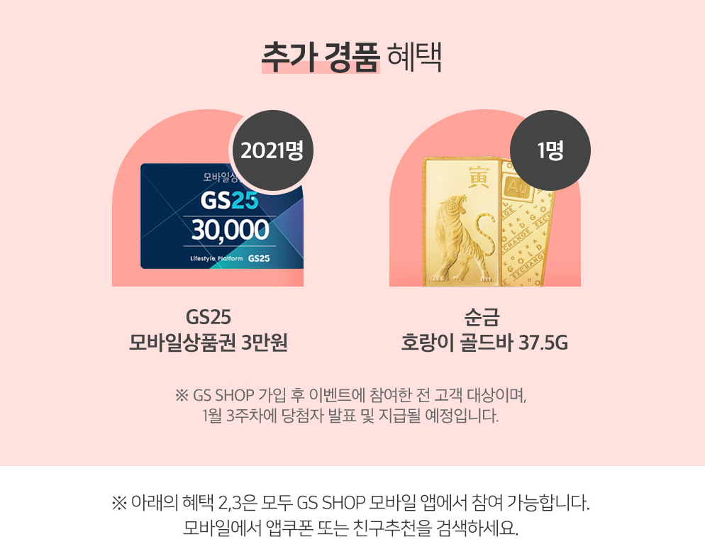 - 신규 고객 대상 경품 : GS25 모바일상품권 3만원 2021명, 순금 호랑이 골드바 37.5G(1명)
