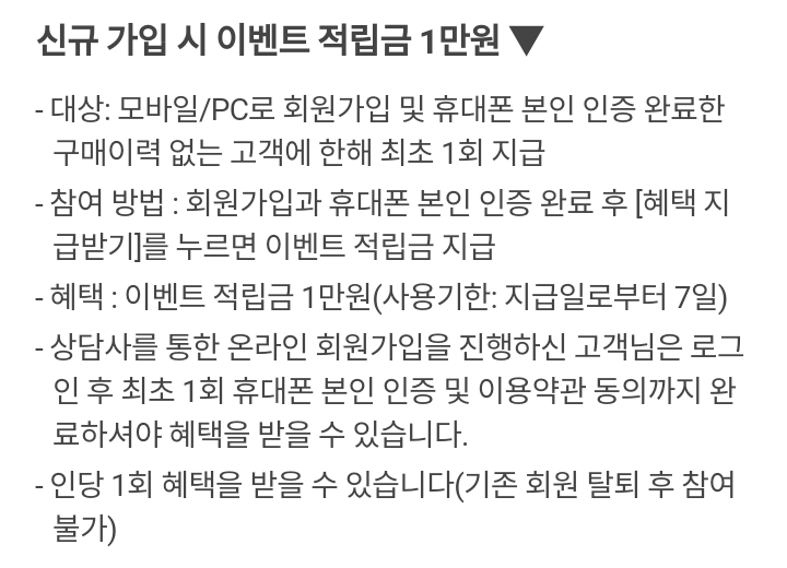 - 혜택1 : 신규가입시 이벤트 적립금 1만원