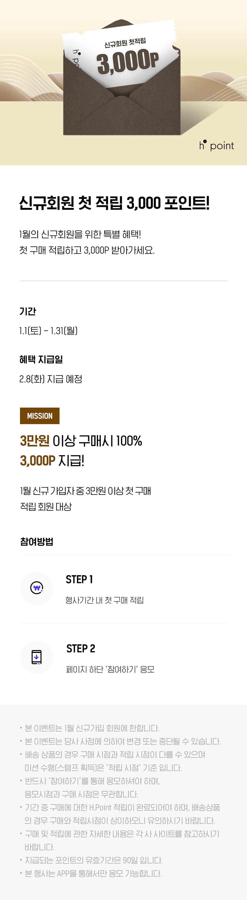 * 1월 신규 가입자 중 3만원 이상 첫 구매 적립 회원 대상