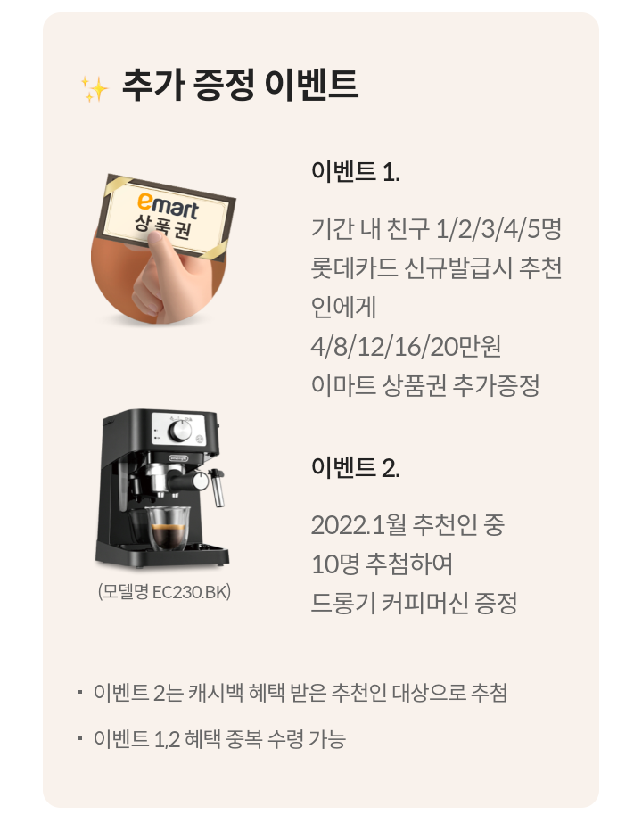 - 이벤트 1 : 기간 내 친구 1/2/3/4/5명 롯데카드 신규발급시 추천인에게 4/8/12/16/20만원 이마트 상품권 추가 증정