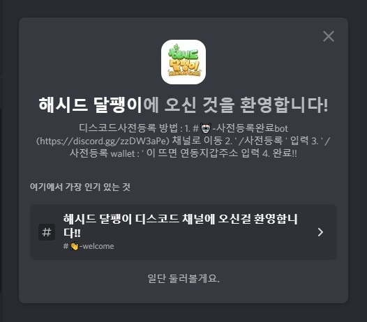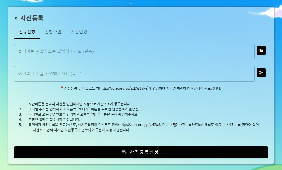 - 해시드달팽이 디스코드 참여(https://discord.gg/zzDW3aPe) → 🤖-사전등록완료bot 채널로 이동 → /사전등록 명령어 입력 → 사전등록 완료