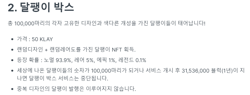 - 생태계 발전을 위하여 지속적으로 달팽이 NFT를 활용한 서비스들을 업데이트할 예정입니다. 우선 클레이튼 네트워크로 서비스를 시작하지만 차후 다양한 네트워크를 멀티 체인 지원할 예정입니다.