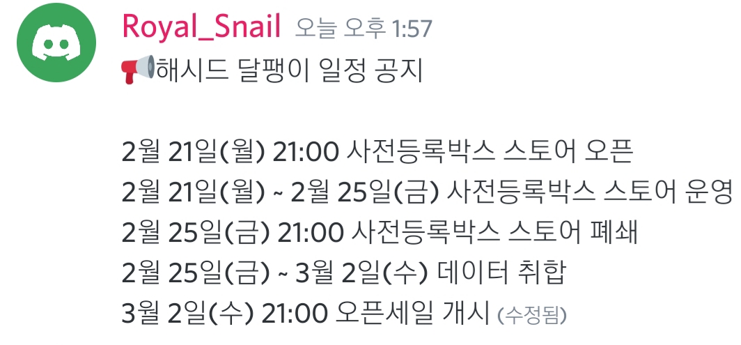 ▶ 해시드 달팽이 오픈세일(3월 2일)