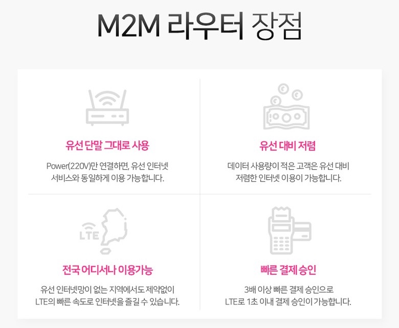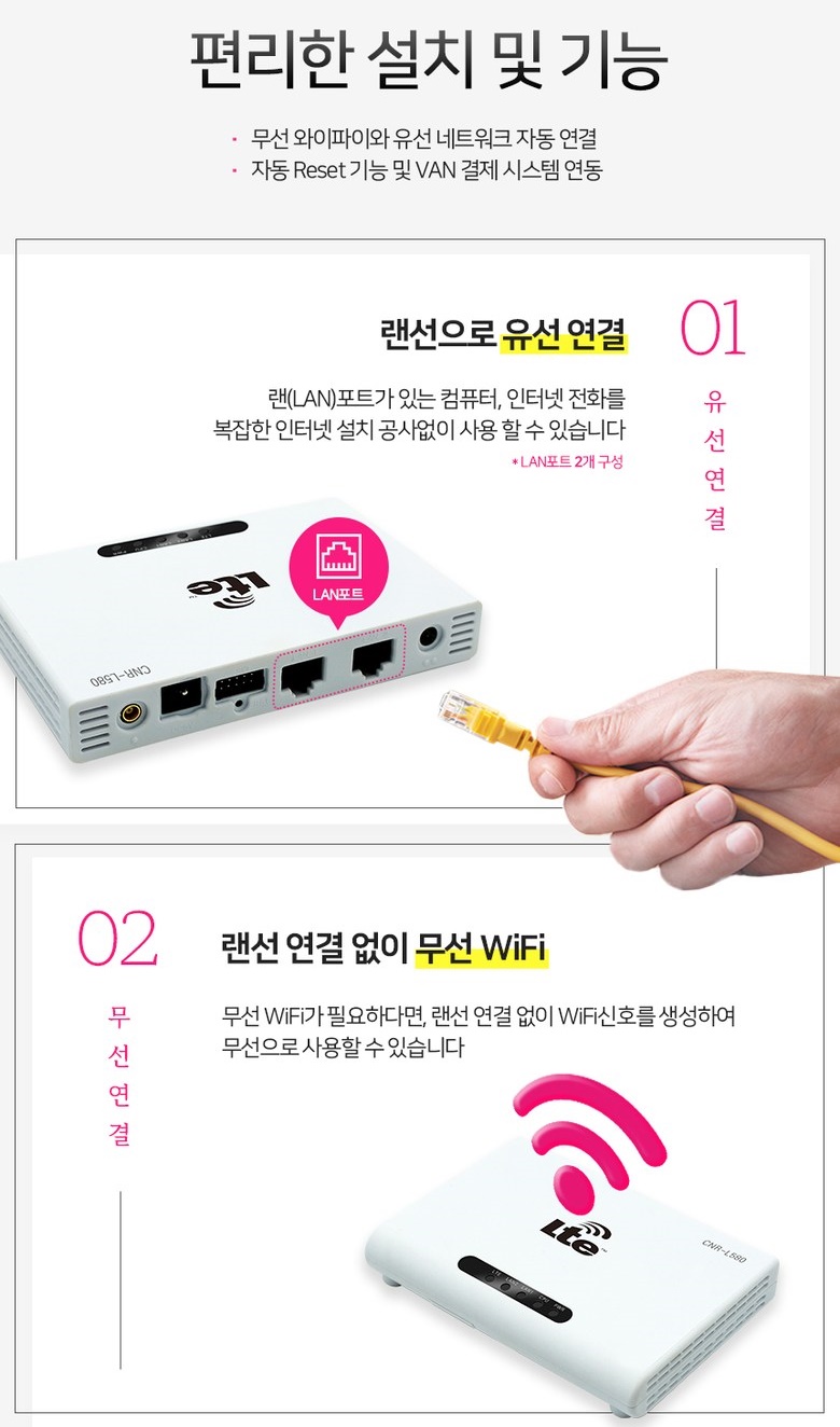 - 모든 POS기, 카드 체크기에 사용 가능하며, 기존 3G 무선 모뎀보다 업무처리 속도가 빠르다.