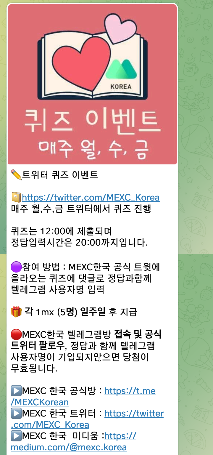 - MEXC한국 공식 트윗에 올라오는 퀴즈에 댓글로 정답과함께 텔레그램 사용자명 입력