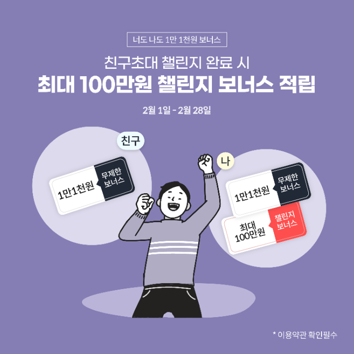 - 챌리지를 시작하고 초대한 3명의 친구 모두가 챌린지 완료 조건을 충족할 경우 최대 21만원의 랜덤 보너스가 지급된다.