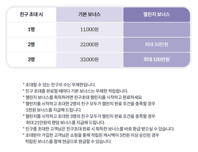 4) 초대받은 3명의 친구 모두 15000원 이상 쇼핑후 캐시백 승인 완료 시 최대 21만원 보너스 적립