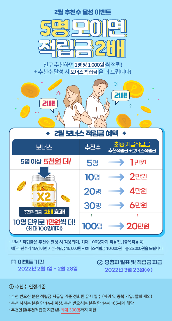 - 친구 추천하면 1명당 1000원씩 적립 + 추천수 달성 시 보너스 적립금을 더 지급!