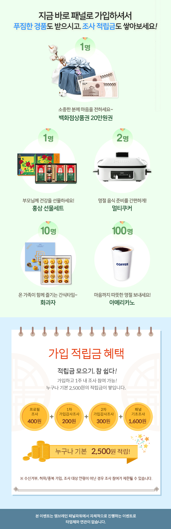 - 엠브레인 패널파워에 가입한 신규가입자 중 추첨을 통해 가입축하선물을 준다.