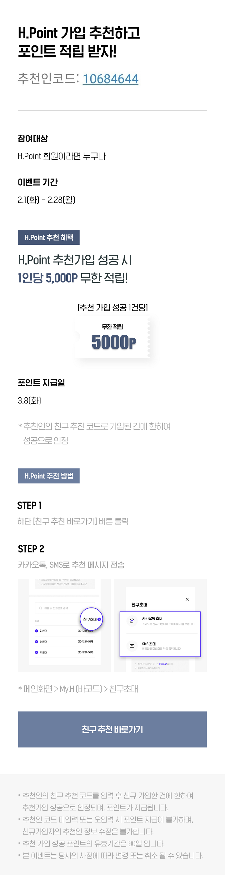 - H.Point 추천가입 성공 시 1인당 5000P 무한 적립!