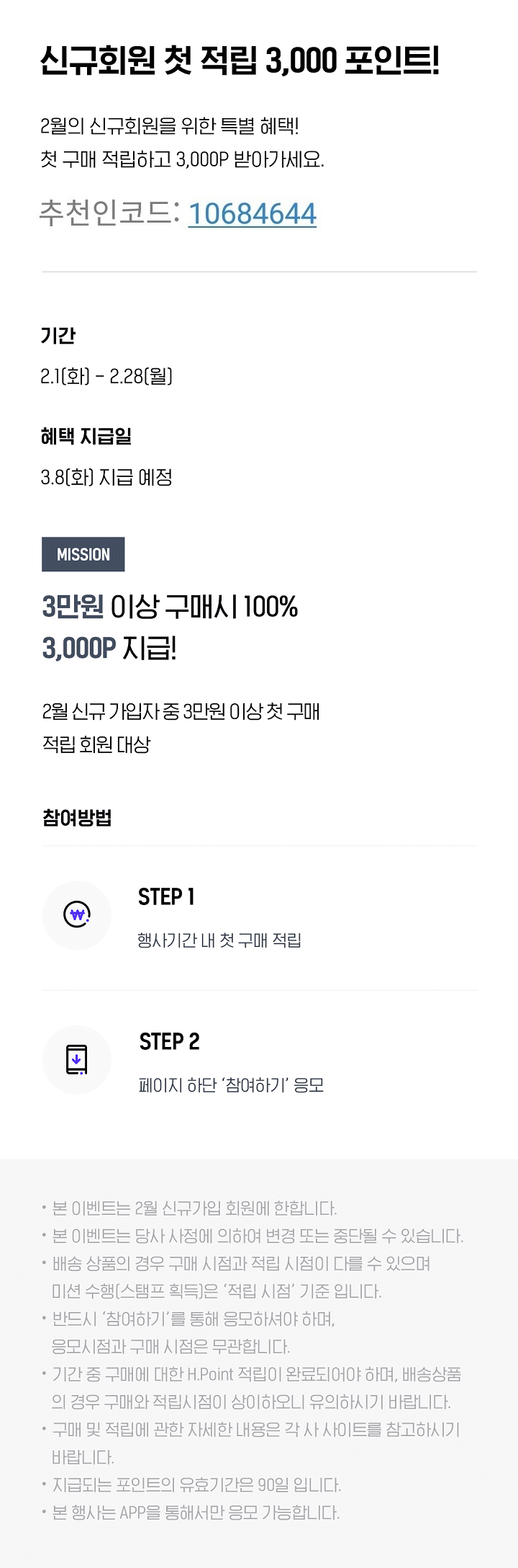 이벤트 기간 동안 2월 H.Point 신규가입자는 첫 구매로 3000P 적립받을 수 있다. 또 H.Point 친구 추천 성공시 마다 1인당 5000P씩 인원수 제한없이 무한 적립받을 수 있다.