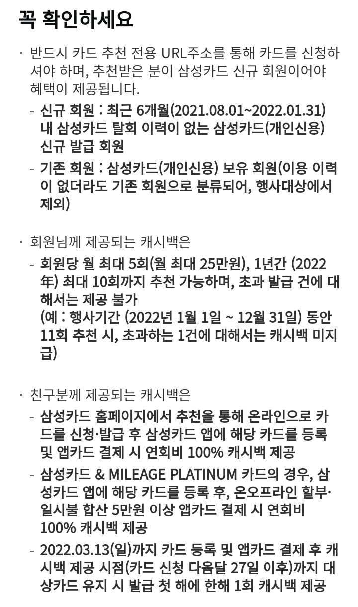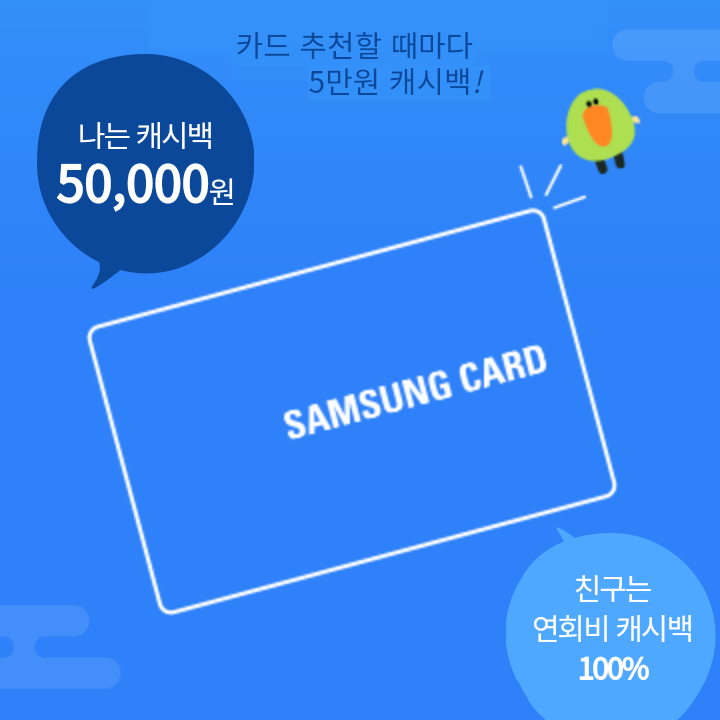 - 삼성카드 홈페이지에서 추천을 통해 온라인으로 카드를 신청, 발급 후 삼성카드 앱에 해당 카드를 등록 및 앱카드 결제 시 연회비 100% 캐시백 제공
