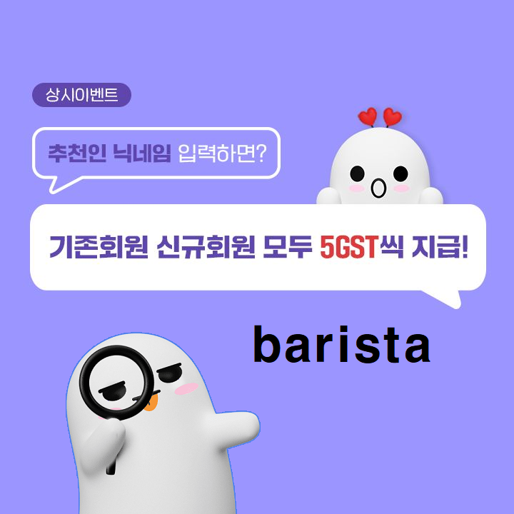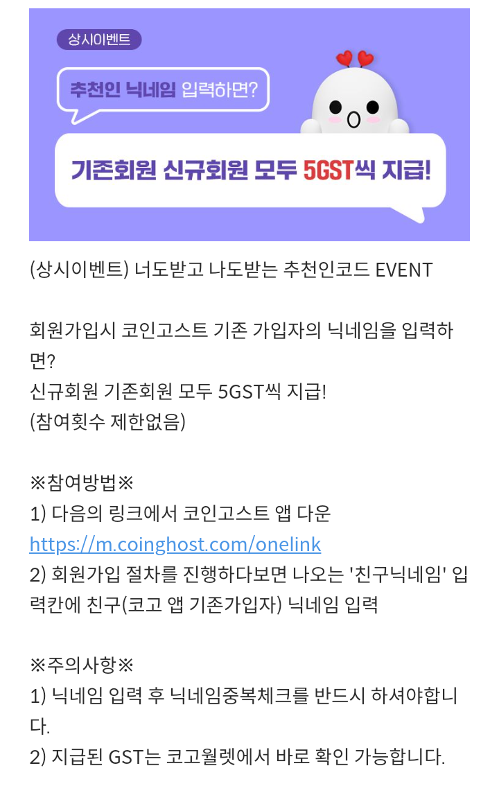 기존 유저도 신규 회원가입을 진행해야 하고, 회원가입할때 친구닉네임을 입력하면 친구도 나도 각각 5GST씩 즉시 지급된다.(참여 횟수 제한 없음)