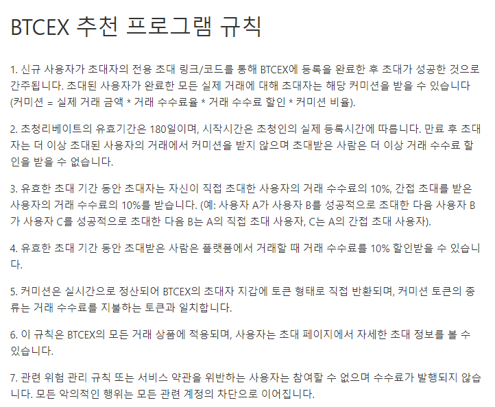 6) 이 규칙은 BTCEX 플랫폼의 전체 거래 상품에 적용되며, 사용자는 초대 페이지에서 자세한 초대 리베이트 정보를 확인할 수 있다.