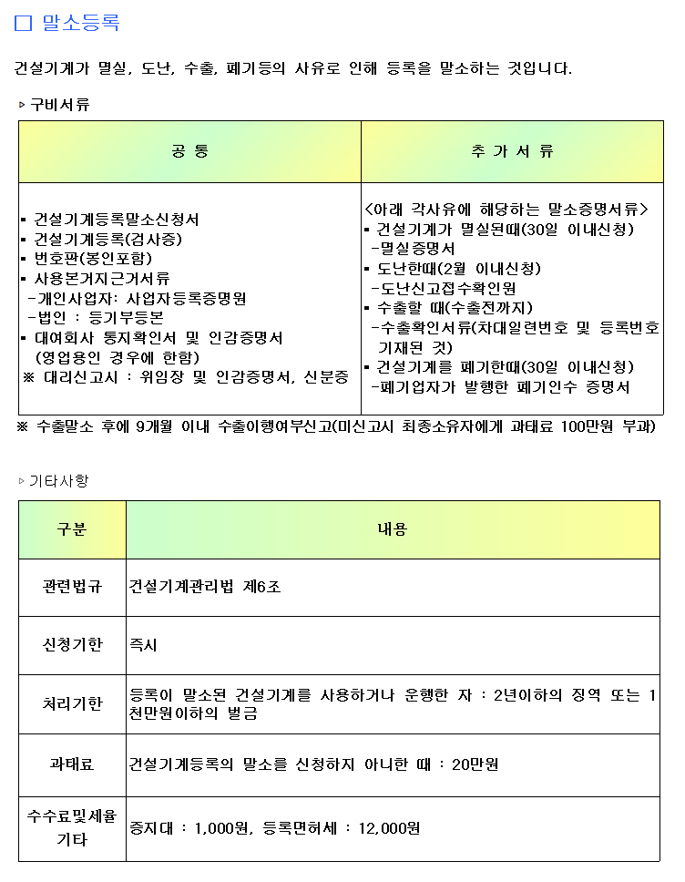 - 건설기계가 멸실, 도난, 수출, 폐기등의 사유로 인해 등록을 말소하는 것을 말한다.